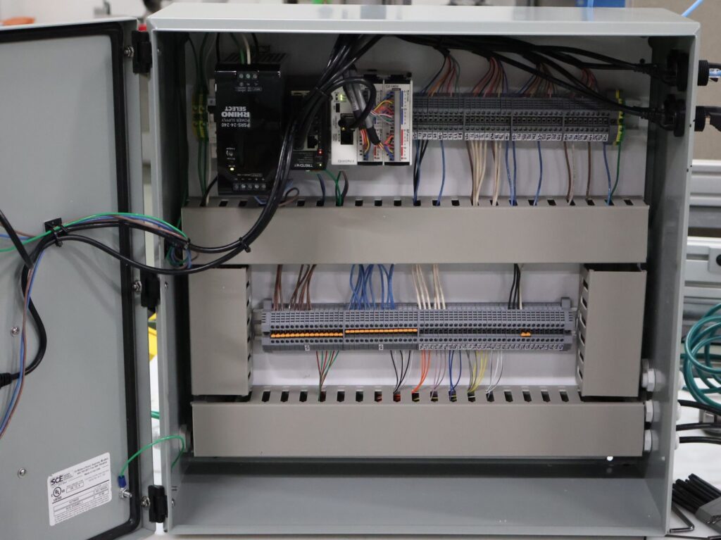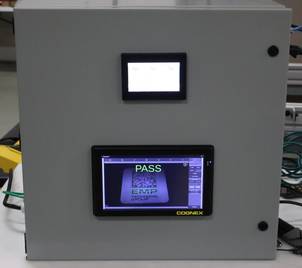 Inside the custom-built enclosure, EMP integrated a Hoffman cabinet, Cognex controller, PLC with touchscreen interface, and three Cognex In-Sight cameras, all wired, programmed, and tested by EMP engineers before installation. Operators can easily select jobs, train cameras on known-good samples, adjust timing delays, and monitor pass/fail results in real time. All the while, EMP’s discrete I/O logic enables these smart pass/fail decisions without complex backend integration. This is a prime example of why match code remains one of EMP’s most powerful custom solutions. Whether mobile or stationary, barcode-based or vision-driven, EMP’s match-code systems help manufacturers ensure the right materials are used every time — with flexible, proven technology that grows alongside their operations.