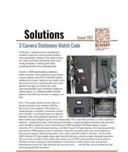 EMP implemented a stationary match-code and vision inspection system using Cognex cameras and a PLC-controlled cabinet engineered in-house. Operators can quickly train the system on known-good barcodes and visual patterns that reject or conduct line stops, delivering flexible, high-confidence inspection without heavy IT overhead.
